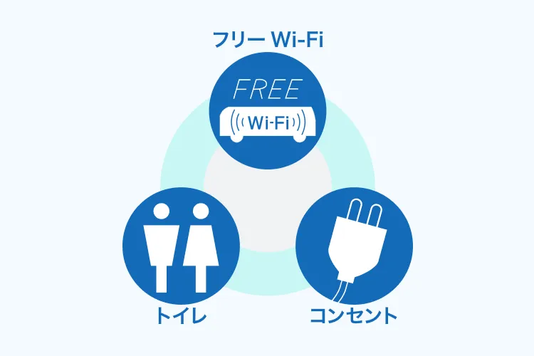 - 화장실, 무료 Wi-Fi, 콘센트 또는 USB 포트 전부 구비