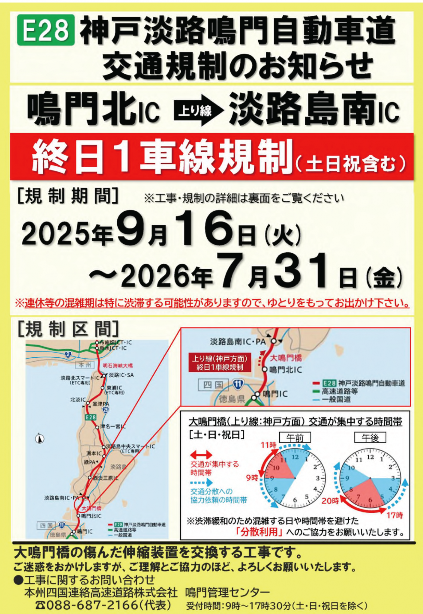 神戸淡路鳴門自動車道「鳴門北IC ~ 淡路島南IC間(上り線:神戸方面)」における工事に伴い、車線規制が実施されているところですが、交通が集中する時間帯のご利用に際して、遅れが生じるケースが増えております。ご利用の際は、ご注意ください。