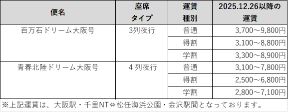 いつも西日本ジェイアールバスをご利用いただきありがとうございます。大阪・京都~金沢・富山線におきましては、ご利用に応じた運賃を設定しておりますが、2025年12月26日運行分より、以下の運賃で運行します。【実施日】 2025年12月26日(金) 乗車分より【対象便】 ・百万石ドリーム大阪号 ・青春北陸ドリーム大阪号 ※夜行便のみ【改定後運賃】