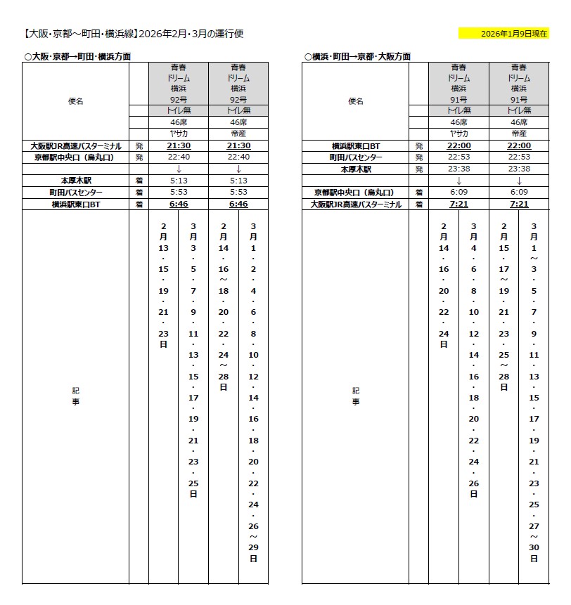 2026年2月~3月における青春ドリーム横浜号の運行について、以下のとおりお知らせいたします。