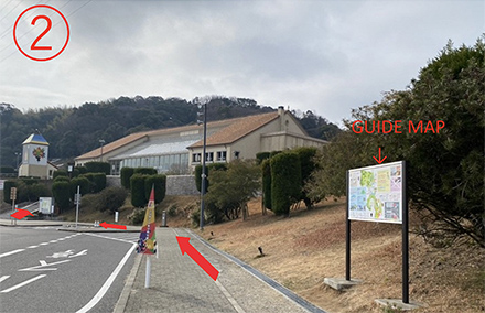 約50m先の右手側に階段が見える。※バス停の近くにある看板でニジゲンノモリのガイドマップが確認できる。