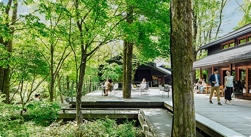 ハルニレの木立の中、16の個性あるショップやレストランが並ぶ「ハルニレテラス」。近くには、日帰り温泉「星野温泉 トンボの湯」や「軽井沢野鳥の森」でネイチャーツアーを行う「ピッキオ」などの施設もあり、軽井沢特有の自然を体感することができます。エリア内は川沿いの遊歩道でつながっていて、ゆったりと散策が楽しめます。
