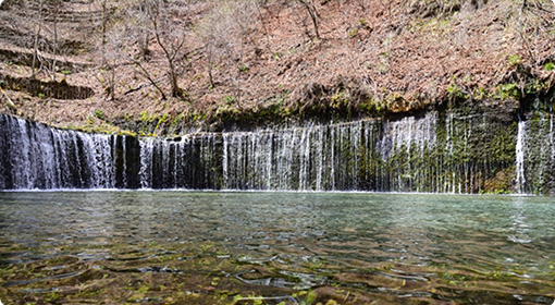 絹糸のような水が“白糸”のように幾重にも流れ落ちる様から、その名前が付けられました。高さ約3m、幅約70mにも及び、秋には紅葉の景色も素晴らしいことから、軽井沢きっての人気観光スポットとなっています。