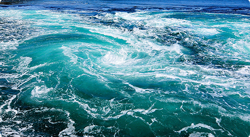 潮の干満によって発生する鳴門海峡の渦潮は、春と秋の大潮時に最大となり、潮流時速20km、最大直径20mにも及ぶものがあります。すさまじい轟音を立てて渦潮が交錯しながら流れていくさまは壮観です。