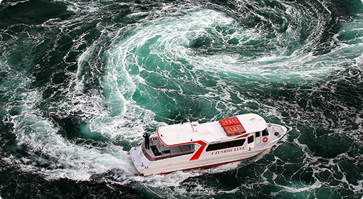 渦の間近まで接近できる新型観潮船「うずしお」。渦潮の飛沫がかかるほど、ぐっと接近の体感クルージングが楽しめます。