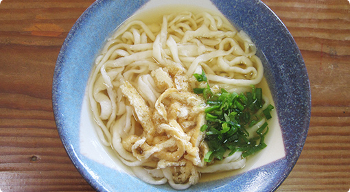 昔から地元の人々に長く愛されきた鳴ちゅるうどん。出汁は黄金色であっさりした醤油味、麺は細めで柔らかく不揃い。具はねぎと刻み揚げが基本で、名物のわかめやちくわを入れる店もあります。
