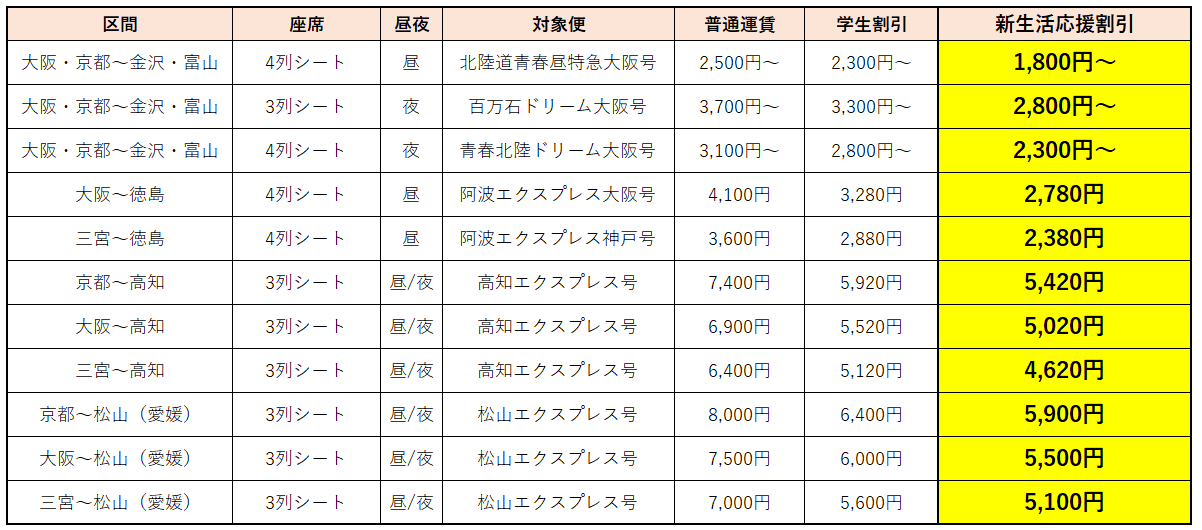 西日本ジェイアールバスとジェイアール四国バスは、来春からの新生活に向けて頑張る学生の皆さんを応援するために、大阪・京都~金沢・富山間、大阪・神戸~徳島間、京阪神~高知間、京阪神~松山間がおトクにご利用いただける「新生活応援割引」を実施します。