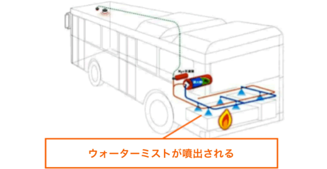 エンジンルームで火災が発生した場合に、火災感知システムが作動して、消火剤を含んだ水を霧状にしてエンジンルーム内に噴射し、酸素を遮断するとともに温度を下げて消火します。