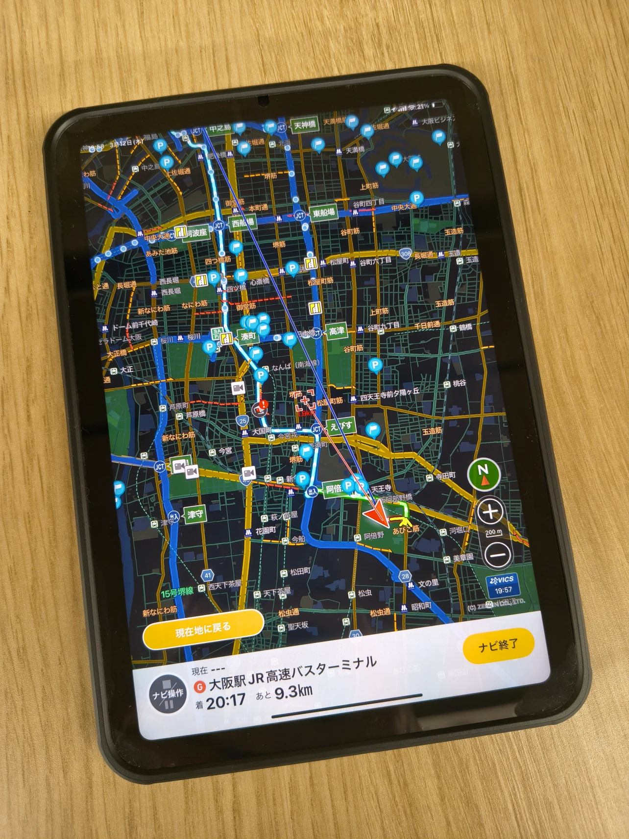 貸切バスにはタブレット端末を活用したカーナビゲーションンステム「バスカーナビ」(ナビタイムジャパン製)を設置しています。