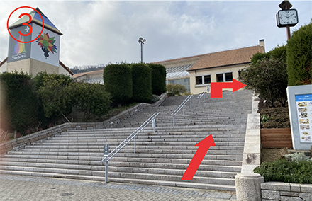 約50m先の右手側に階段が見える。※バス停の近くにある看板でニジゲンノモリのガイドマップが確認できる。