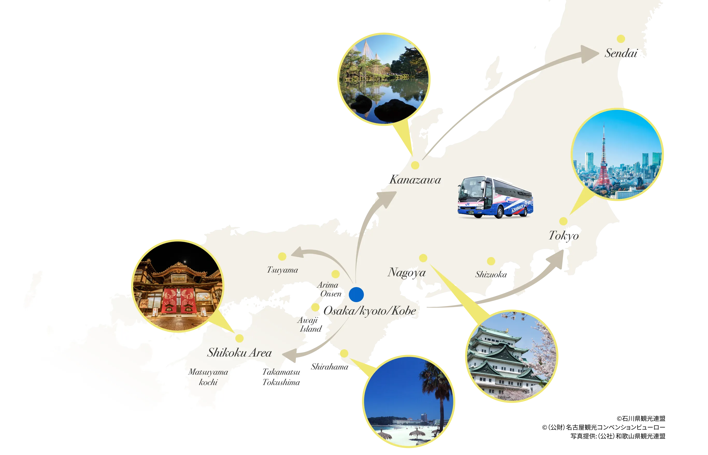 JR巴士的主要站点,例如大阪站、京都站、三宫站、东京站和金泽站,都位于JR站附近,交通便利。即使是初次乘坐JR巴士的旅客也能轻松找到。巴士总站与JR火车站相邻,方便您悠闲地度过出发前的时光。